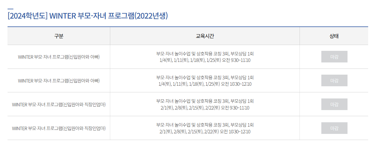 홈페이지에 들어가서, 상단 메인메뉴에 “프로그램 신청” > “부모-자녀교육” 카테고리로 들어가게되면, 년생 별로 프로그램 리스트가 나온다.