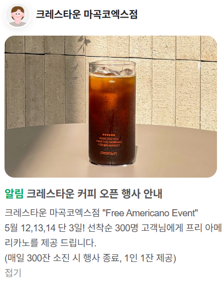 아! 2025년 5월 12일부터 이벤트를 한다.3일 동안 선착순 300명 고객분들께 무료 아메리카노 제공!!