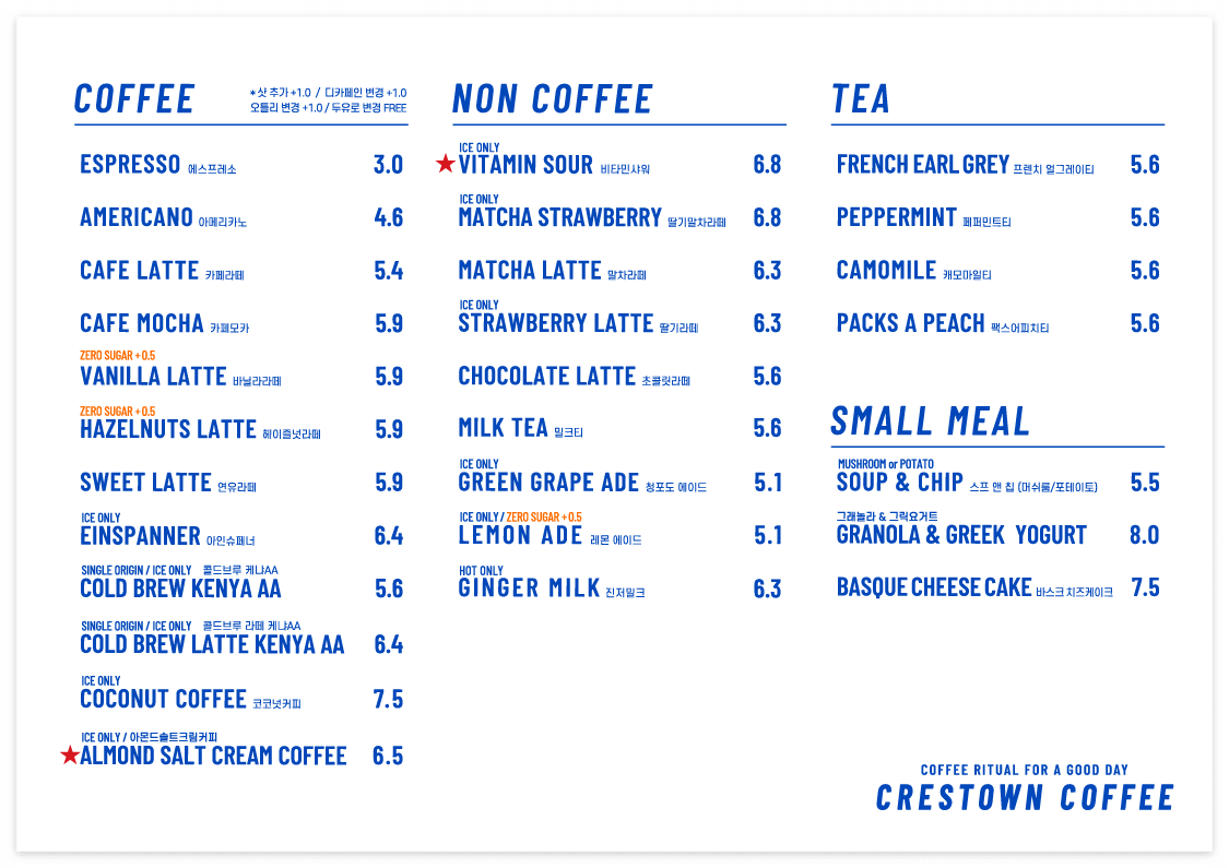 크레스타운은 외식 명문 기업 원앤원(주)에서 2022년에 새롭게 론칭한 카페 브랜드로, "Coffee ritual for a good day"라는 슬로건 아래 최근 마곡코엑스점을 포함하여 여러 지점을 오픈하며 브랜드를 확장 중이다.