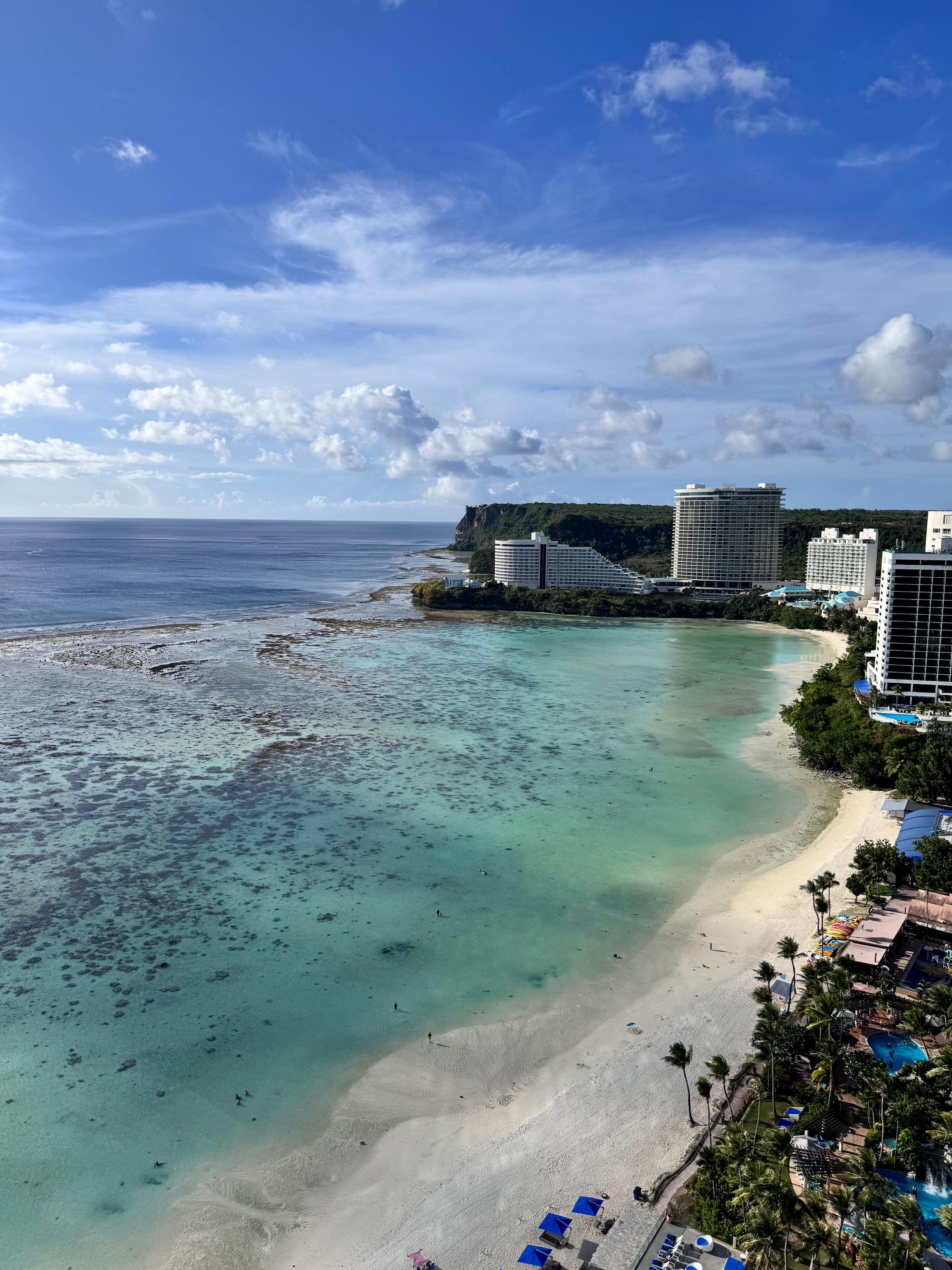 두짓타니는 정말 깔끔하고 서비스도 좋았다. 주차장에 연결된 엘리베이터로 내려와 로비에 도착했을 때는,, 이곳에서 바라보는 투몬비치 뷰도 참 좋았다. 그리고 우리가 이미 도착했을 때는 체크인줄이 조금 있었다. 그런데 방 배정을 받고 난 뒤에 보니까 줄이 훨씬 길어졌다.