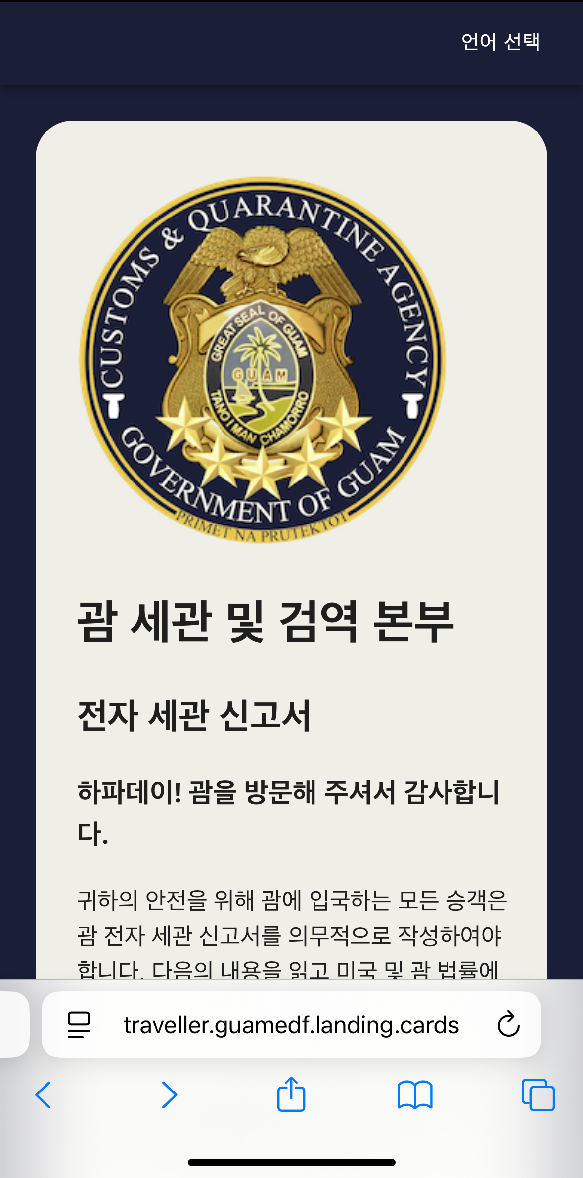 괌 전자 세관신고서란? 괌 전자 세관신고서는 모든 승객들이 괌에 입국하기 전 반드시 작성해야 하는 온라인 양식입니다. 방문객들의 안전과 편의를 위해 해당 양식은 괌 도착 72시간 전부터 작